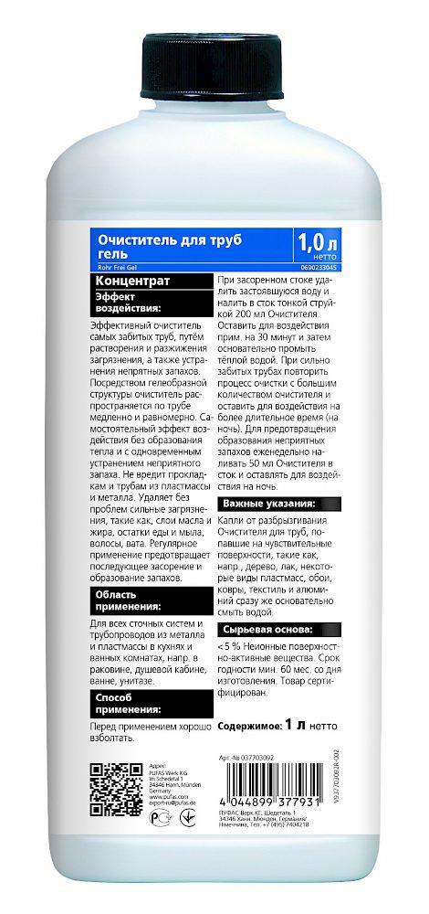Эффективный очиститель самых забитых труб, путём растворения и разжижения загрязнения, а также устранения неприятных запахов. Посредством гелееобразной структуры очиститель распространяется по трубе медленно и равномерно. Самостоятельный эффект воздействия без образования тепла и с одновременным устранением неприятного запаха. Не вредит прокладкам и трубам из пластмассы и металла. Удаляет без проблем сильные загрязнения, такие как, слои масла и жира, остатки еды и мыла, волосы, вата. Регулярное применение предотвращает последующее засорение и образование запахов.